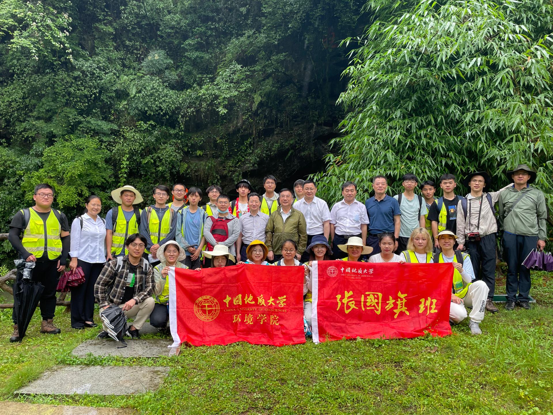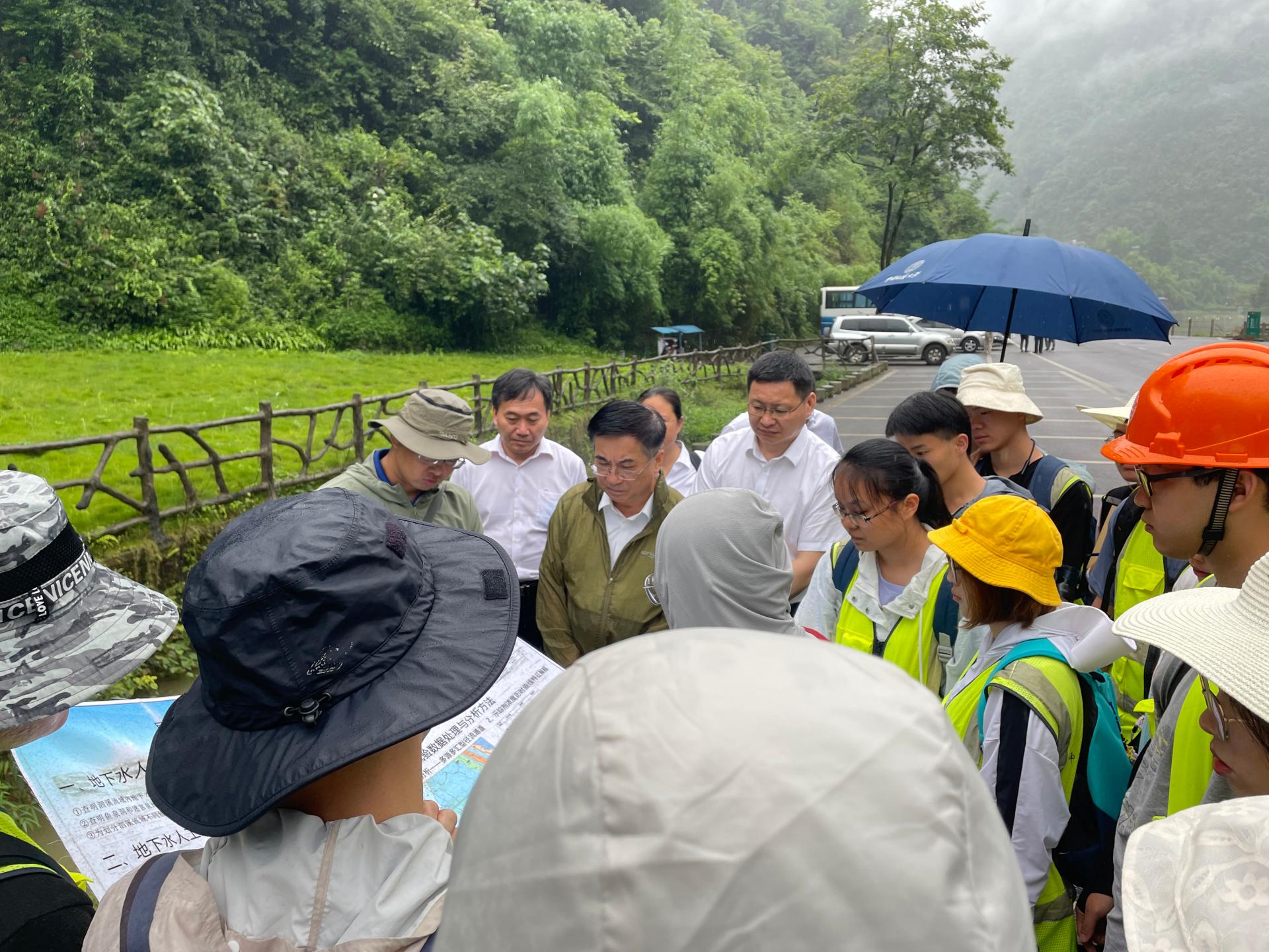 实习途中,王焰新边看、边听、边问,查看同学们的野外记录簿,听取泗溪专题调研小组代表蔡子延同学的学习汇报,询问同学们环境地质与水文地质现象特点,与同学们一起探讨泗溪专题工作区的水文地质条件、岩溶发育规律、地下水系统结构、水资源及水环境现状等。