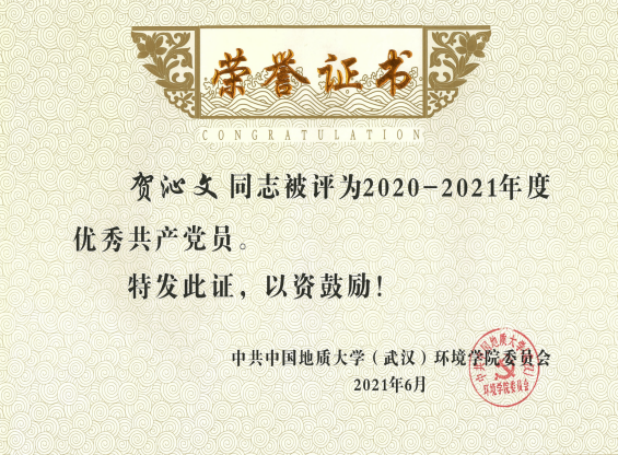 按照专业设置党支部,把支部建在专业上。贺沁文担任地下水专业大学生党支部书记,积极组织党支部开展各类政治理论学习与实践,参与365体育投注 “张国旗班”行动计划,2021年地下水专业大学生党支部被评为365体育投注 年度先进基层党组织,贺沁文被评为优秀共产党员。2018级中加班坚持思想引领,以党建带动团建,班团一体共奋进。团支部连续两年获得“校级五四红旗团支部”荣誉称号。