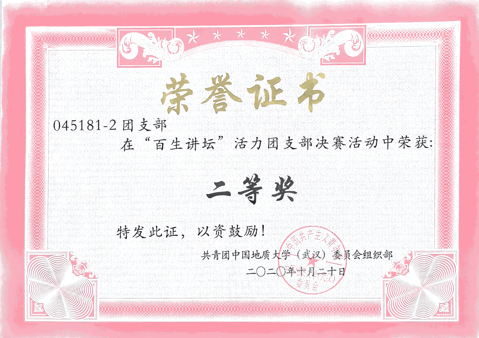 2020年校级“百生讲坛”活力团支部二等奖