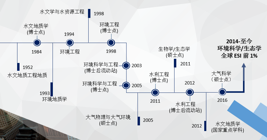 发挥多学科交叉优势,初步形成涵盖水、地、气、生的"大环境"学科生态系统框架,包括:环境科学与工程(2003)、水利工程(2012)博士后流动站;环境科学与工程(2005)、水利工程(2011)一级学科博士点和省重点学科;水文地质学(2012,国家重点)、环境微生物与生态技术(2012,自设)二级学科博士点;生物学(2011)、大气科学(2016)一级学科硕士点。拥有生物地质与环境地质国家重点实验室(共享)、盆地水文过程与湿地生态恢复校级学术创新基地(C类)、地下水与环境湖北省国际合作示范基地等平台。